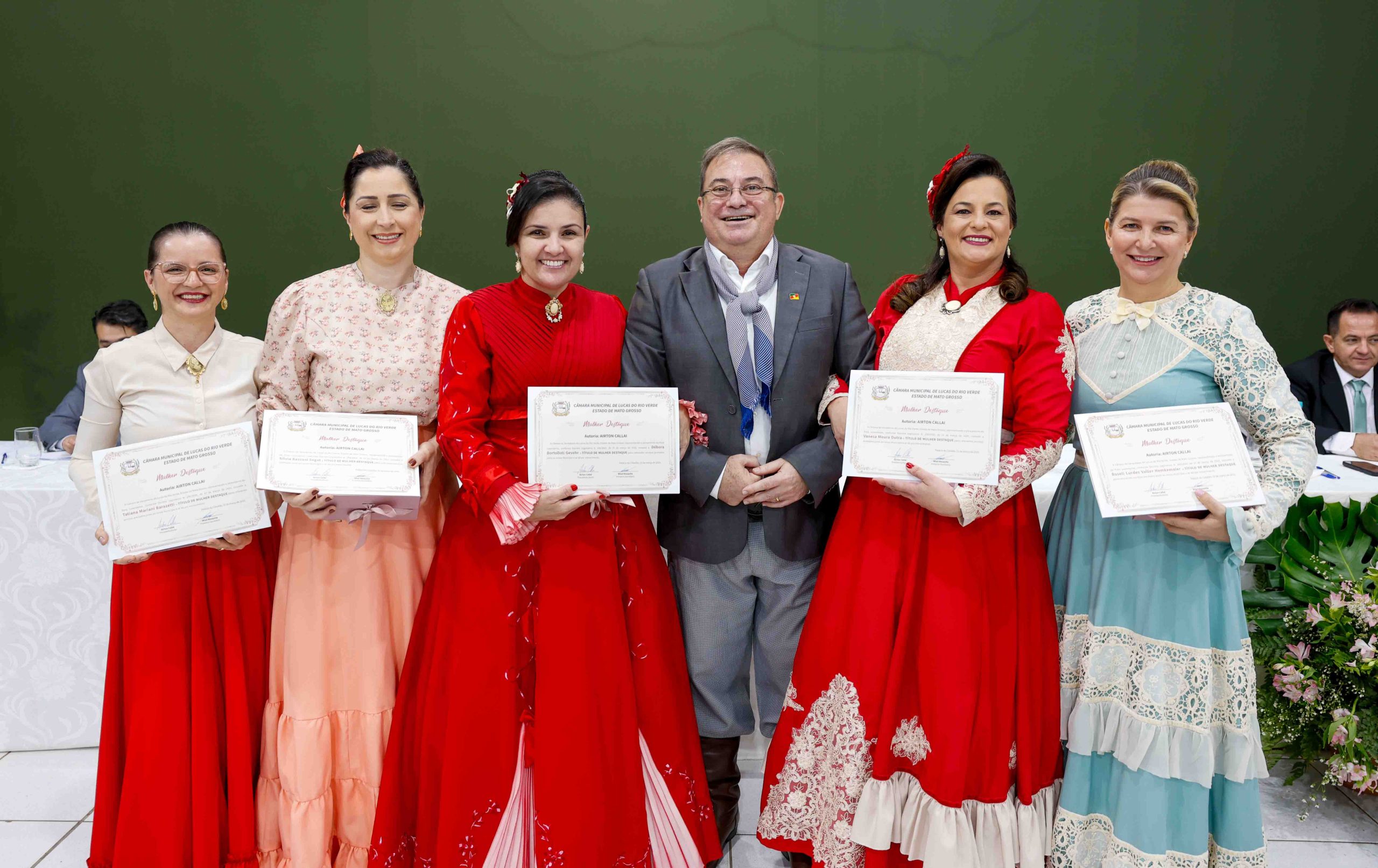 O vereador Airton Callai homenageou cinco mulheres ligadas ao CTG Sentinela da Tradição: Débora Bortolloti Gevehr, educadora e tradicionalista que preserva as raízes gaúchas em sala de aula; Roseli Lurdes Valter Hemkemaier, conhecida por seu acolhimento na comunidade e no Serviço de Animação Vocacional SAV; Silvia Bassani Segat, vice-patroa do CTG e engajada em ações sociais; Tatiana Mariani Barazetti, advogada que alia tradição gaúcha a projetos solidários; e Vanesa Moura Dutra, patroa do CTG e professora que integra cultura e empatia em iniciativas comunitárias.