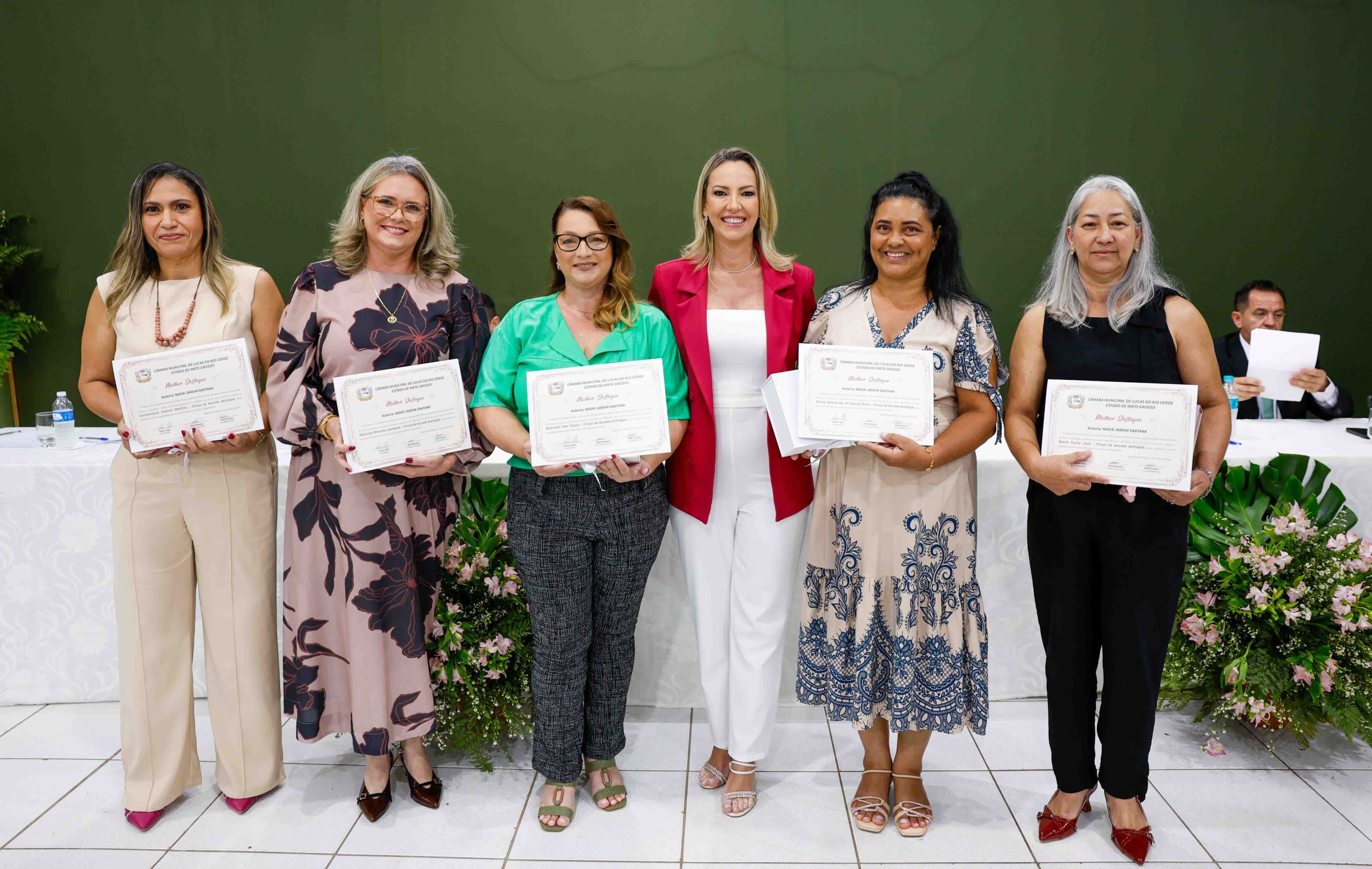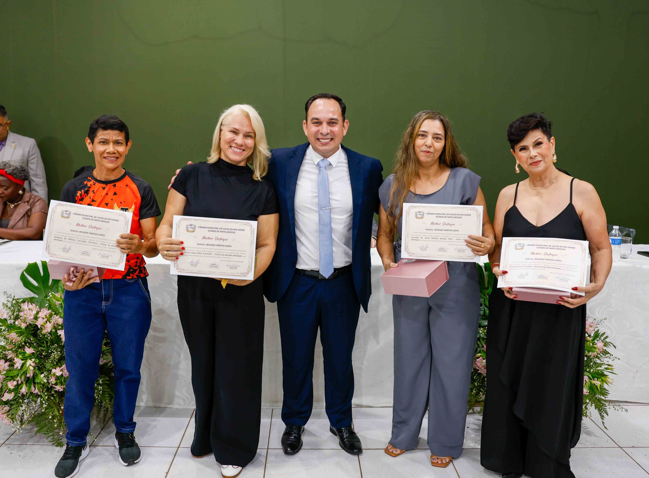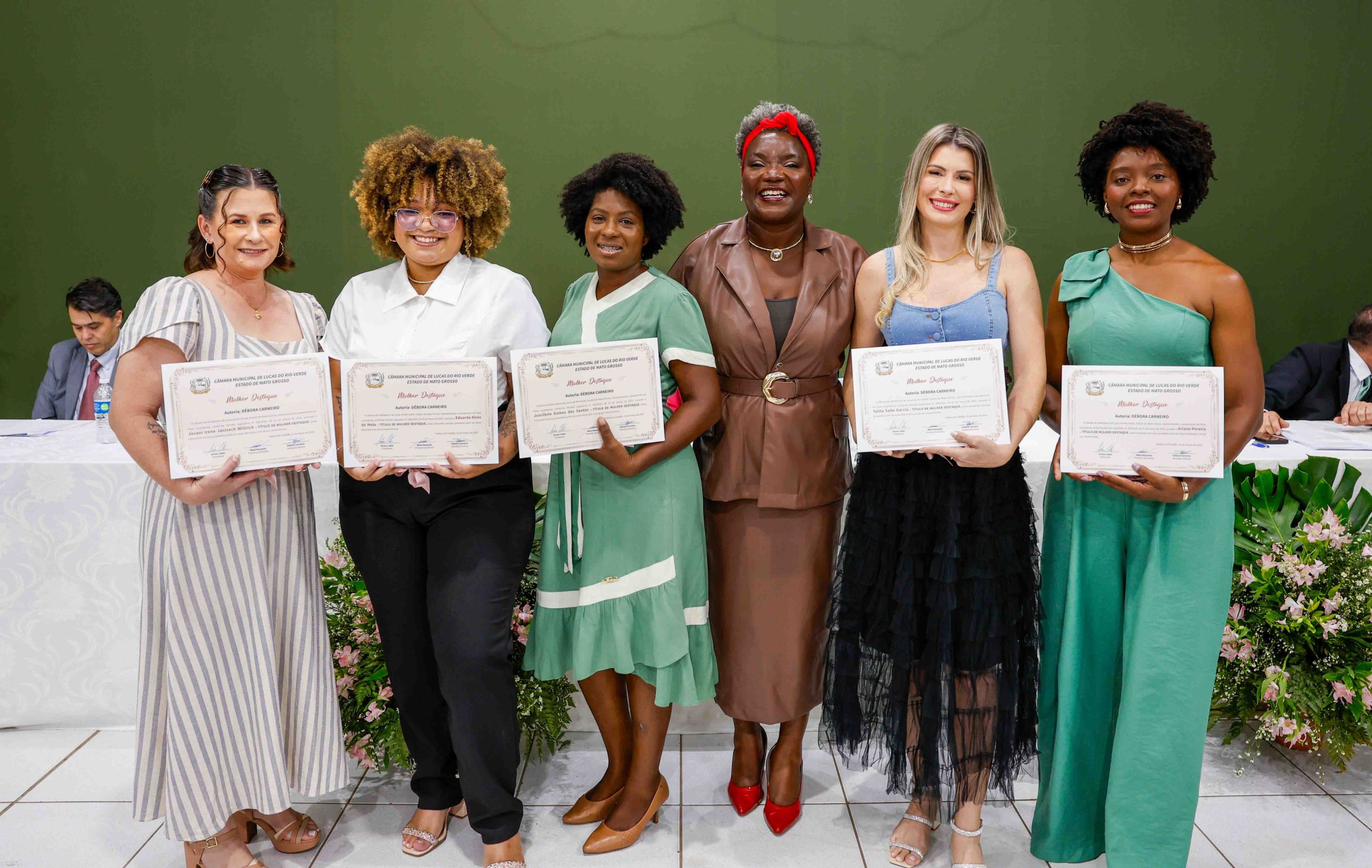 A vereadora Débora Carneiro homenageou cinco mulheres que se destacam por sua atuação profissional e social em Lucas do Rio Verde: Ariane Pereira, especialista em cabelos crespos que promove a autoestima feminina através de seus salões e projetos sociais; Eduarda Alves, trancista profissional que valoriza a beleza afro e capacita outras mulheres; Jovani Willrich, agente comunitária de saúde que atua como multiplicadora de informações essenciais para a população; Juscilene Santos, integrante do grupo ‘Dorcas’ que presta assistência a pessoas em vulnerabilidade; e Talita Garcia, empresária e atuante em ações sociais em sua comunidade cristã.