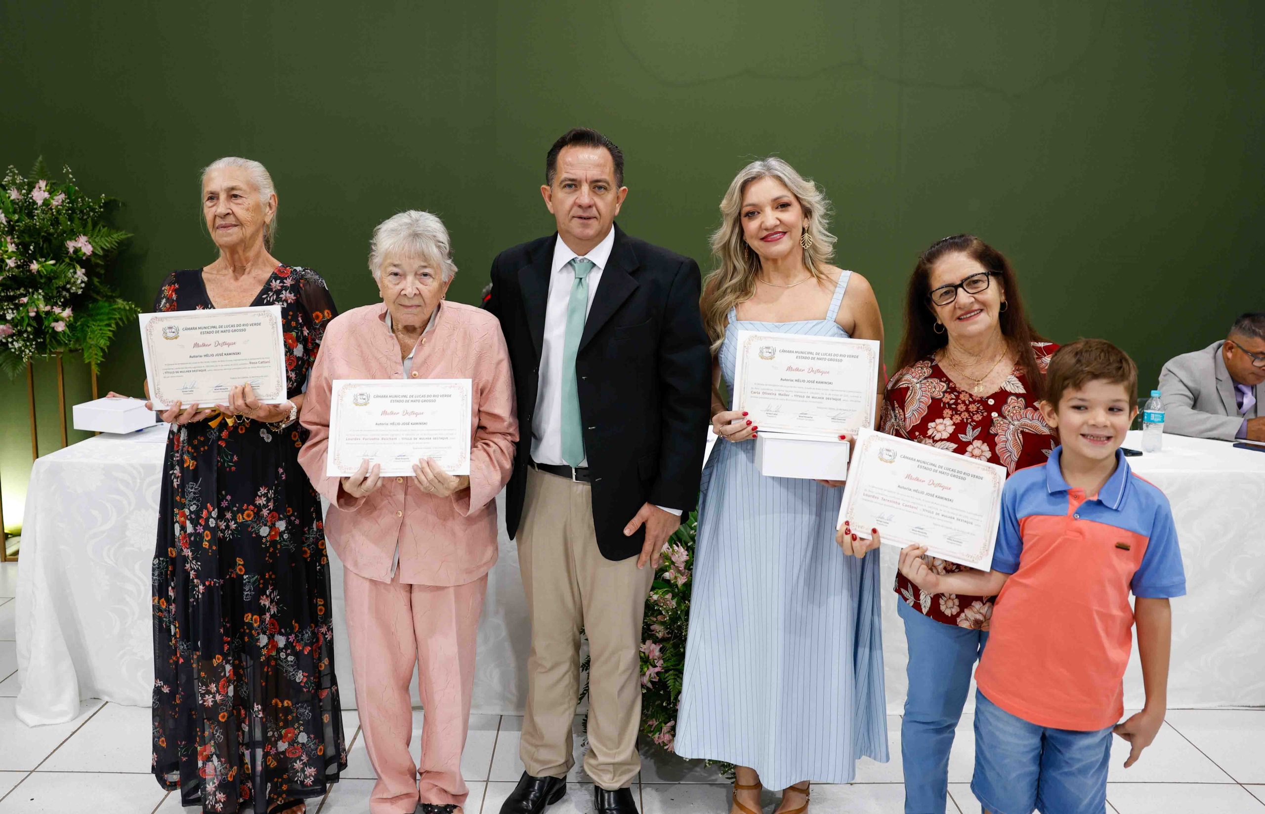 O vereador Hélio Kaminski reconheceu mulheres de trajetórias marcantes: Carla Meller, empreendedora que transforma vidas através da beleza; a agricultora Lourdes Parizotto; Lourdes Cantoni, voluntária ativa em projetos sociais e hospitalares; e Rosa Cattani, empresária pioneira no transporte rodoviário local.