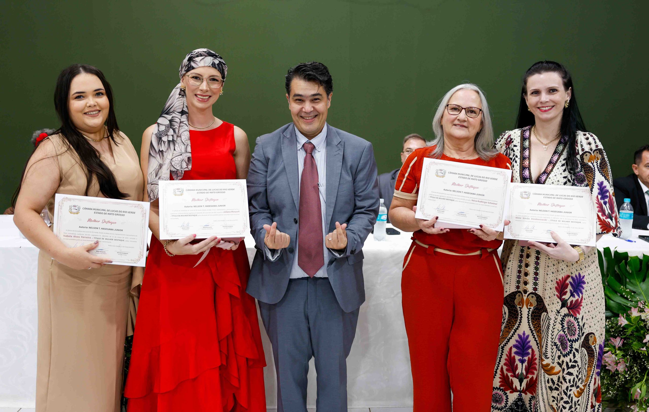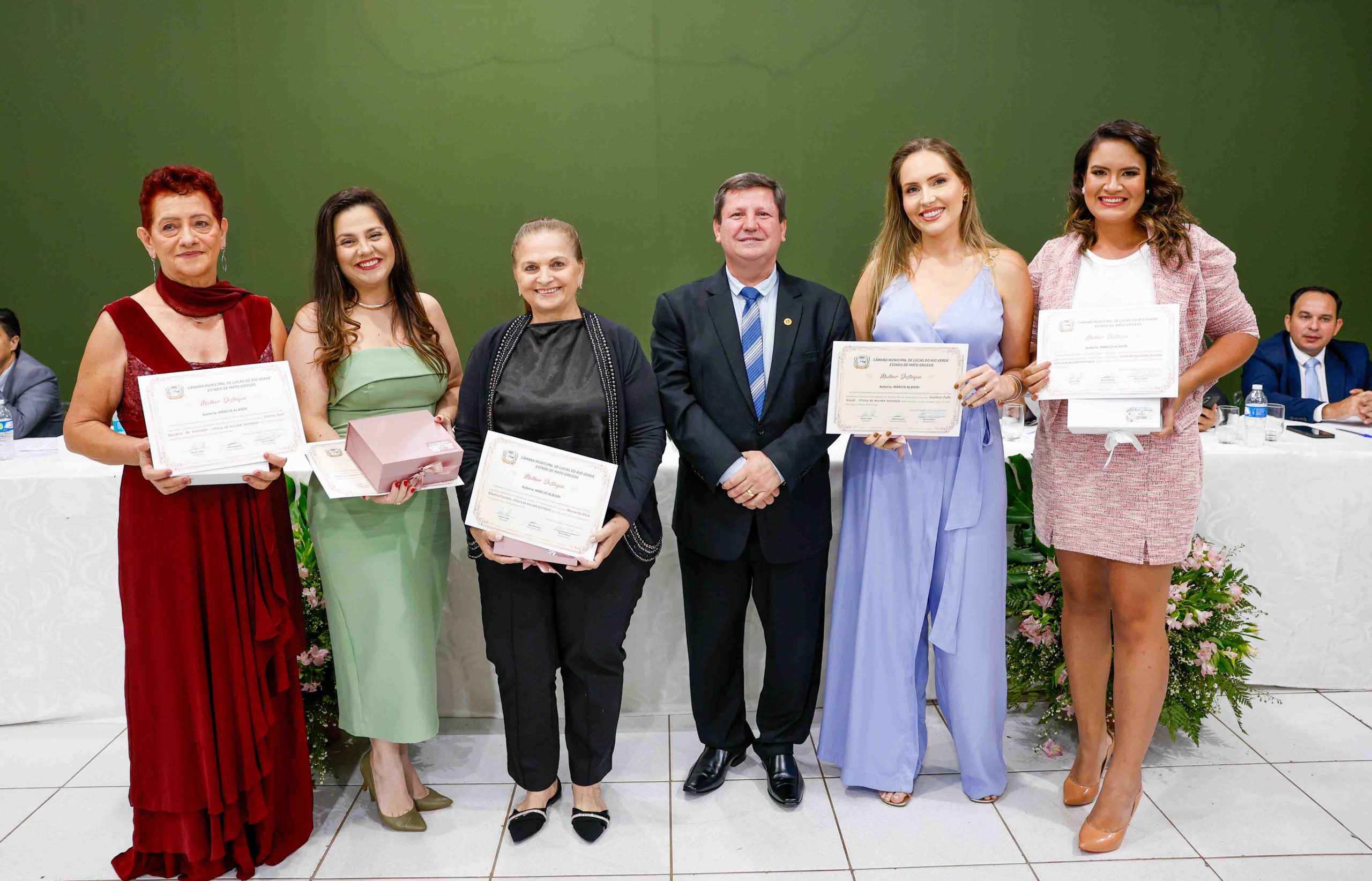 O vereador Márcio Albieri enalteceu cinco profissionais luverdenses: Carla Martins, jornalista da Rádio Agro FM; Fátima Andrade, empreendedora do ramo de buffet e atuante em eventos sociais; Monica Testa, advogada e rotariana, integrante do projeto para plantio de árvores em Lucas e implantação da hemodiálise no município; Neusa Correia, assistente social hospitalar, além de voluntária na Casa Lar; e Suellem Nicoli, empresária imobiliária e rotariana.
