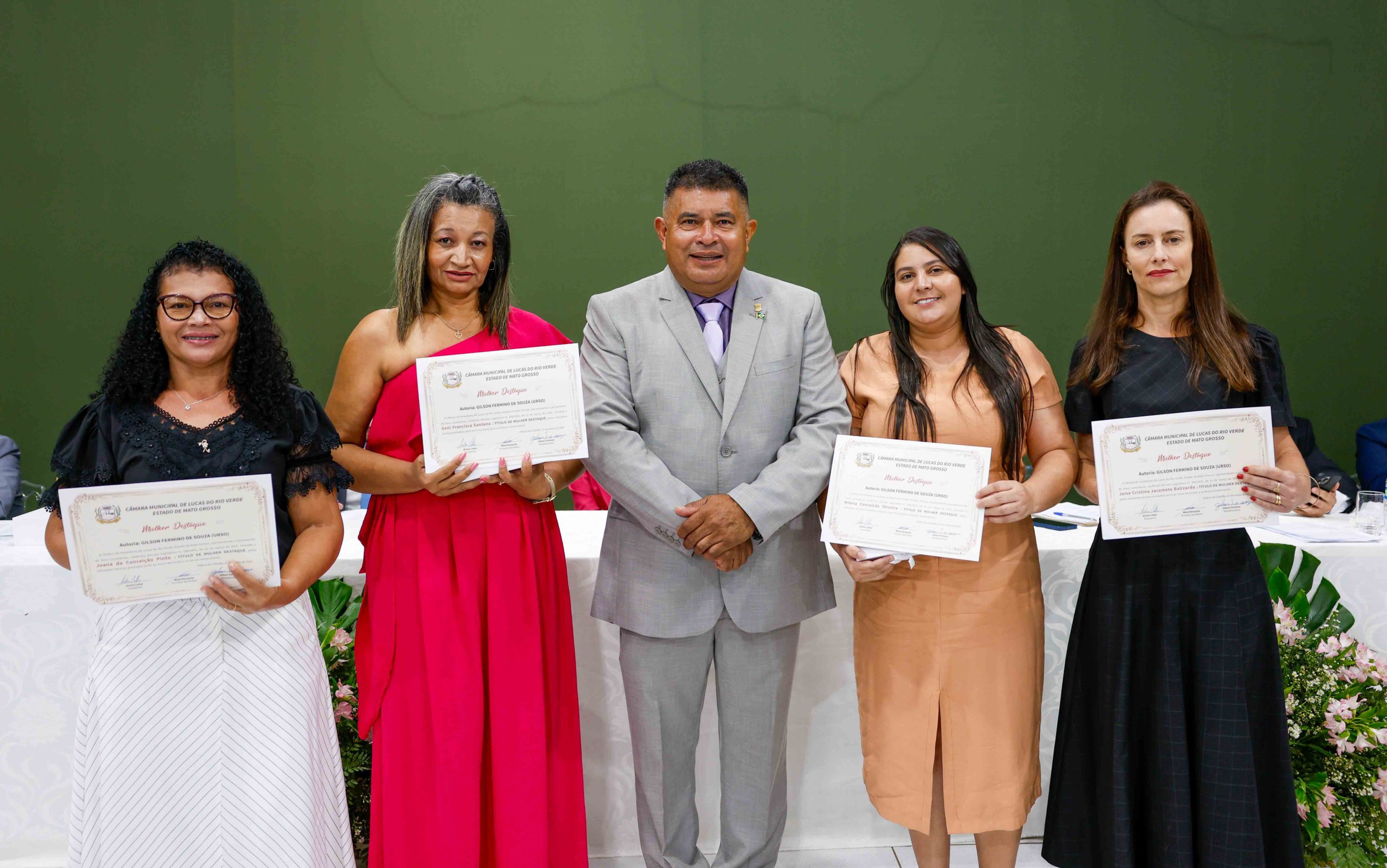 O vereador Gilson Urso homenageou mulheres dedicadas ao desenvolvimento social em Lucas: Geni Santana, presidente do Sindicato dos Trabalhadores Rurais e promotora de arte-terapia; Joana Pinto, fundadora do projeto “Os Amigos das Crianças” e coordenadora do “Sopão Social”; Joise Jacometo, farmacêutica e atuante em pastorais católicas; e Milena Oliveira, pastora que auxilia na ressocialização de pessoas através da igreja.