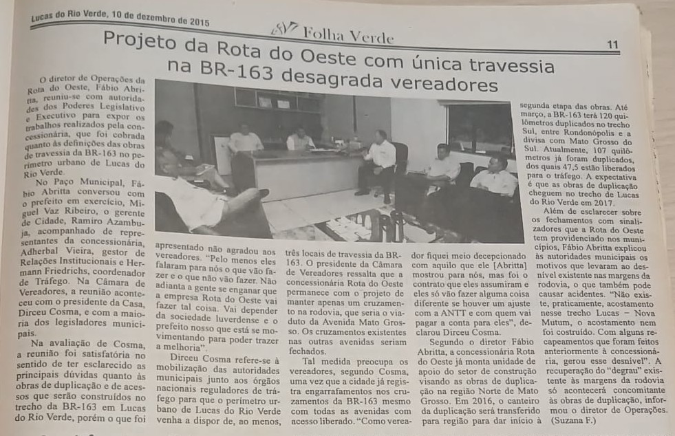 Na ocasião, as autoridades luverdenses já haviam alinhado a necessidade de discutir de forma ampla os desafios envolvendo a BR-163, especialmente a preocupação com o número de travessias previstas no projeto da concessionária. “Nós queremos, no mínimo, quatro travessias. Não tem como Lucas do Rio Verde funcionar com apenas duas. A proposta deles prevê três viadutos, mas apenas duas travessias. Para nós, isso não atende à necessidade atual e muito menos ao futuro do município”, defendeu Callai na reunião com a concessionária.