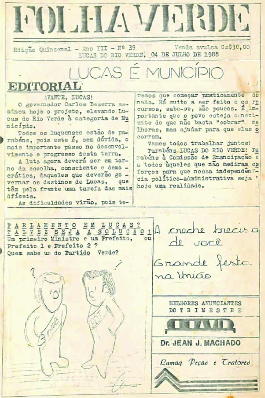 “Enfrentamos muitas dificuldades, mas as coisas aconteceram muito rápido, se a gente pensar que em 5 de agosto de 1982 a gente lançou a pedra fundamental do núcleo urbano e não tinha nada, só tinha um acampamento do Incra [Instituto Nacional de Colonização e Reforma Agrária, órgão do governo federal responsável pela implantação do projeto de assentamento Lucas do Rio Verde] lá no início da cidade, no bairro Pioneiro, as casas do Incra e mais nada. E em seis anos, em 4 de julho de 1988, nós entregamos emancipado isso aqui: da pedra fundamental pra emancipação foram apenas seis anos, é um tempo recorde”, orgulha-se o pioneiro que também fez parte da Comissão Pró-Emancipação.