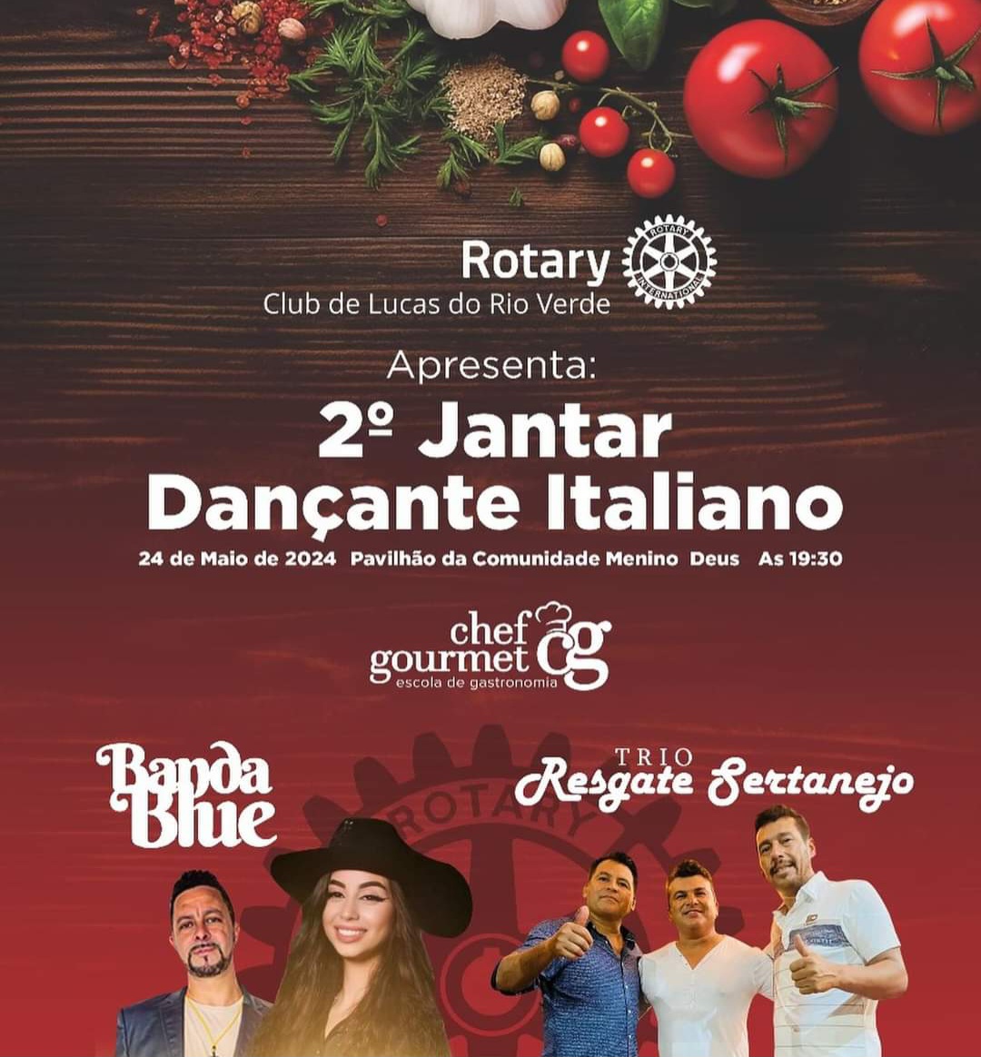 O Rotary Club de Lucas do Rio Verde promove nesta sexta-feira, 24 de maio, o 2º Jantar Dançante Italiano com mais de 18 iguarias, entre pratos principais, saladas, molhos e acompanhamentos, além de sobremesa, tudo preparado com muito carinho pela equipe da Chef Gourmet Escola de Gastronomia de Lucas do Rio Verde.